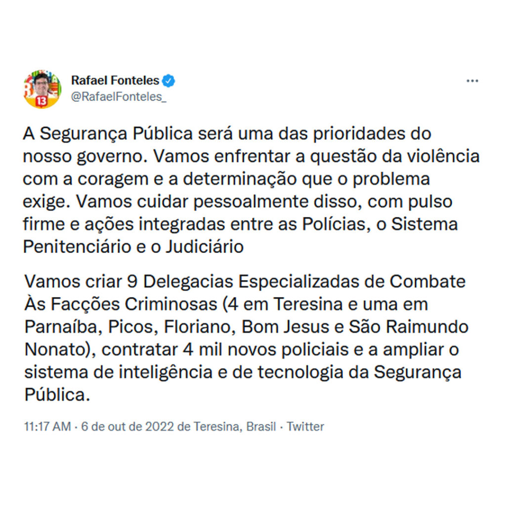 O candidato eleito a Governador, Rafael Fonteles (PT), anunciou através de sua rede social Twitter nesta quinta-feira (6), a criação de 9 delegacias para combater facções criminosas no Piauí.
