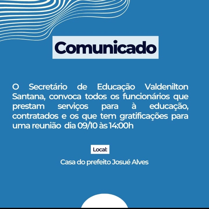 “O Secretário de Educação Valdenilton Santana, convoca todos os funcionários que prestam serviços à educação, contratados e os que tem gratificações para uma reunião dia 09/10 às 14:00h na casa do prefeito Josué Alves”, diz publicação postada nas redes sociais.