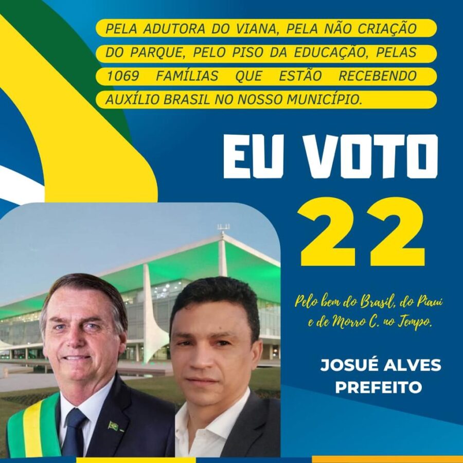 Em um card também postado nas redes sociais, o prefeito diz a seguinte frase: “Pela adutora do Viana, pela não criação do parque, pelo piso da educação, pelas 1096 famílias que recebendo auxílio no nosso município, eu voto 22, pelo bem do Brasil, do Piauí e de Morro Cabeça no Tempo”.
