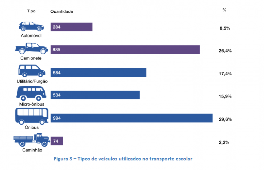 São 3.355 veículos terrestres de passageiros utilizados nos serviços de transporte escolar dentre os quais 37% não são autorizados para o transporte coletivo de alunos. Cerca de ¼ dos Municípios possuem em sua frota mais da metade de veículos nessa condição. A idade média da frota usada pelos Municípios é de 17,8 anos. 80% dos veículos possuem mais de 7 anos de uso. Os veículos mais antigos, em termos de idade média, são caminhões e camionetes; os mais novos, ônibus. Somente 26% dos veículos da frota são de propriedade dos Municípios.