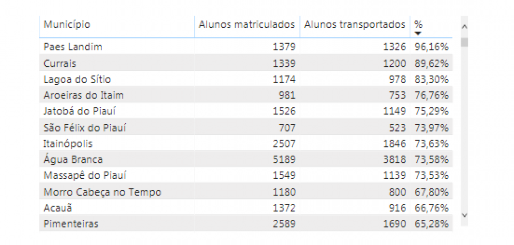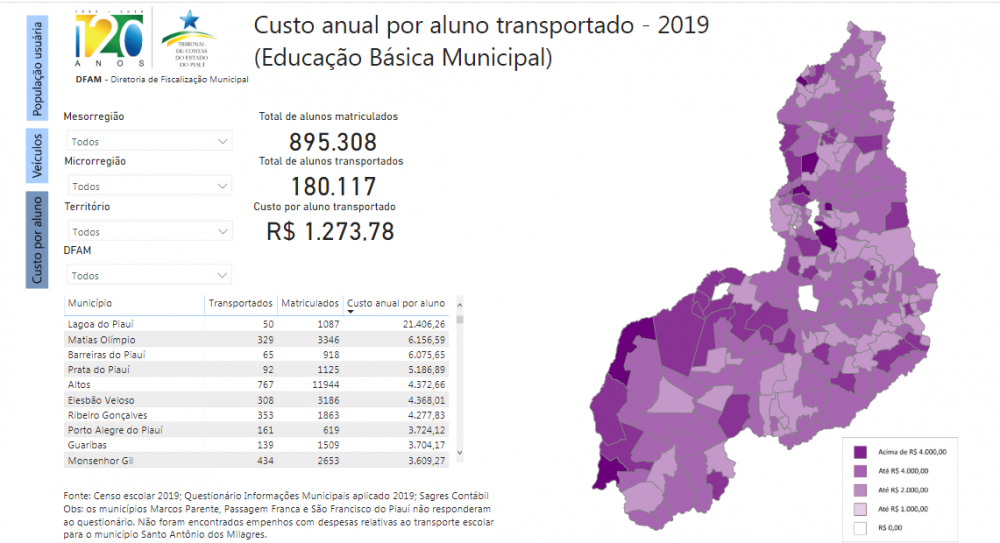 Um levantamento do Tribunal de Contas do Estado do Piauí (TCE/PI) sobre a situação do transporte escolar no Piauí revela que 37% dos veículos utilizados não são autorizados para o transporte coletivo de alunos. A idade média da frota usada pelos municípios é de 17,8 anos e o custo médio anual por aluno transportado é R$ 1.273,78. No ranqueamento dos municípios pelo custo anual por aluno transportado mais elevado, o valor referente ao primeiro colocado é 220 vezes maior em relação ao último e em 15 municípios o custo médio por aluno transportado é superior a R$ 3 mil, mais que o dobro da média estadual.