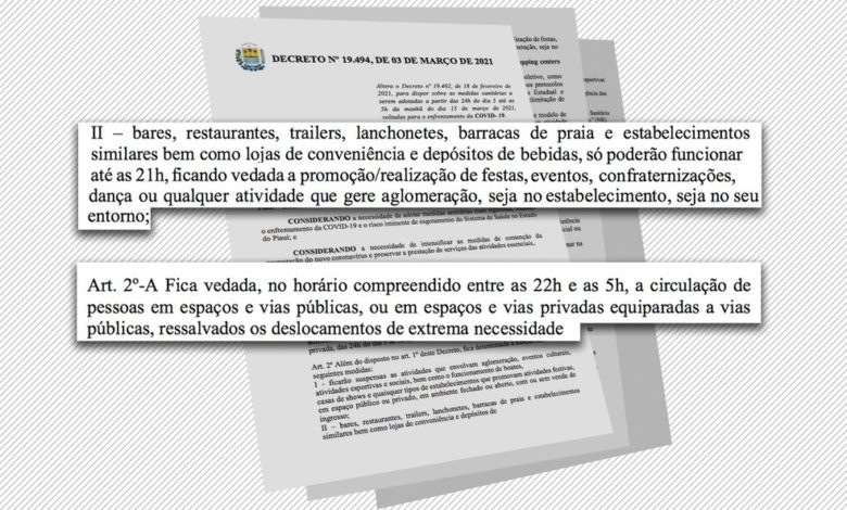 Bares, restaurantes, trailers e lanchonetes podem funcionar até às 23h, mas não podem realizar confraternização, festas ou qualquer evento que gere aglomeração. O decreto também dispõe sobre os eventos realizados ou patrocinados pelo Poder Público.
