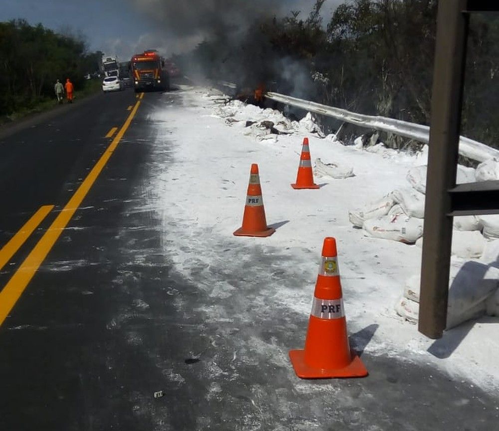 “Após o tombamento, dois pneus foram sacados para fora e pegaram fogo. O incêndio atingiu também a vegetação ao lado da pista e, a Polícia Rodoviária Federal (PRF) nos acionou”, afirmou.