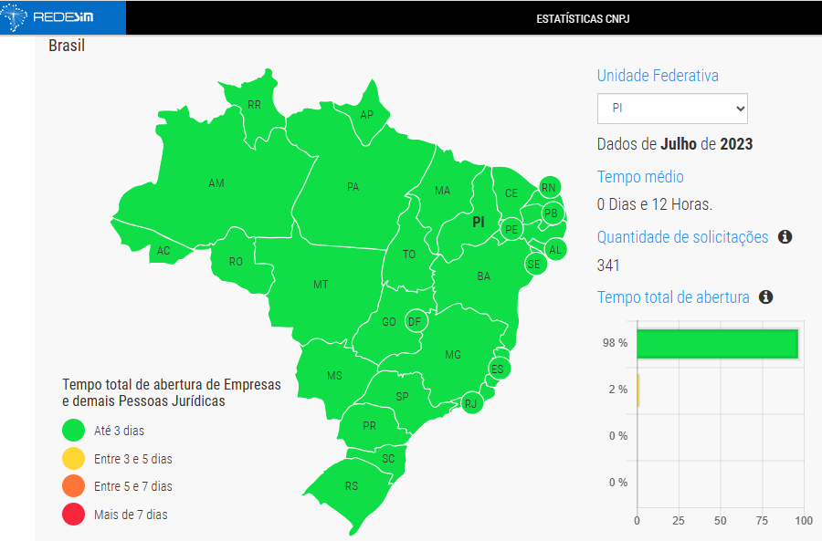 O tempo total de registro de empresas na Junta Comercial do Estado do Piauí (Jucepi) foi de 12h no mês de julho de 2023.