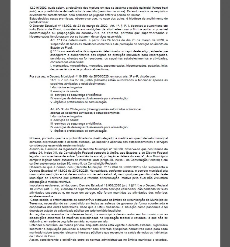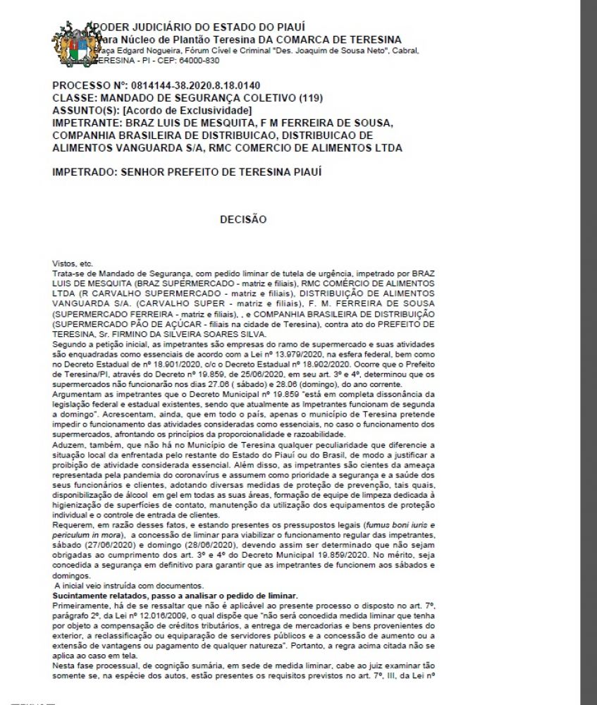 O mandado de segurança coletivo foi impetrado por cinco grupos de supermercados que argumentam que, em todo o país, apenas o município de Teresina pretende impedir o funcionamento das atividades consideradas como essenciais, no caso o funcionamento dos supermercados, “afrontando os princípios da proporcionalidade e razoabilidade”.