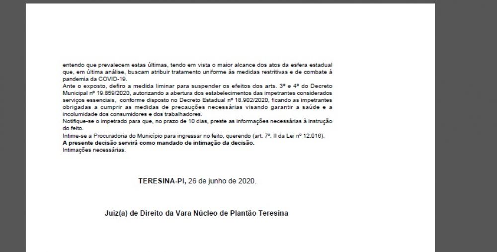 O mandado de segurança coletivo garantiu o funcionamento dos estabelecimentos comerciais e tornou sem efeito o Decreto baixado pela Prefeitura de Teresina.