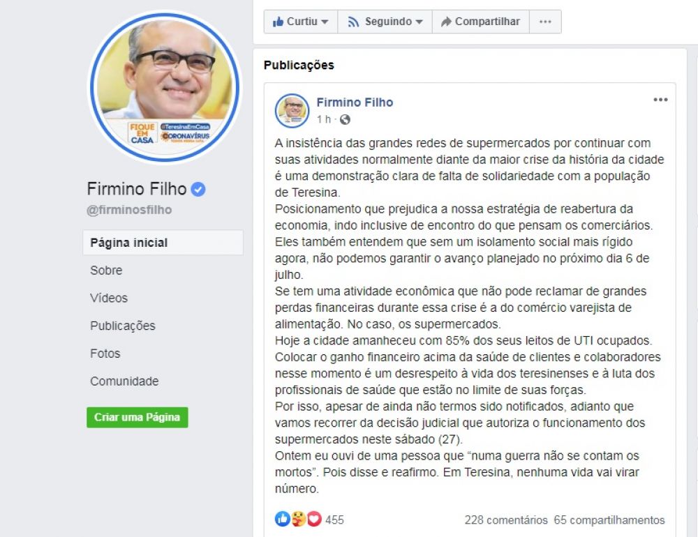 O prefeito de Teresina, Firmino Filho (PSDB), disse através de postagem em suas redes sociais, que “a insistência das grandes redes de supermercados por continuar com suas atividades normalmente diante da maior crise da história da cidade é uma demonstração clara de falta de solidariedade com a população”.