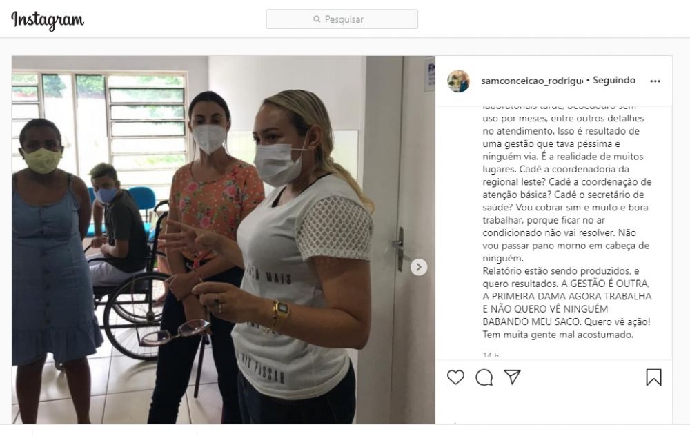 Ao final da postagem, Samara ainda cutucou a ex primeira-dama, a deputada estadual Lucy Soares (Progressistas). Em caixa alta, ela disse agora a gestão é outra, e que a primeira dama trabalha e não quer gente babando saco.
