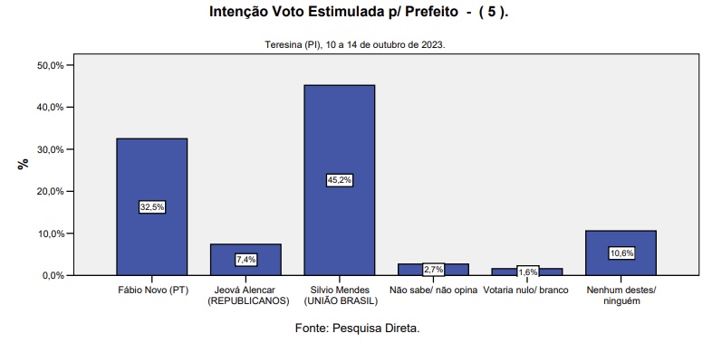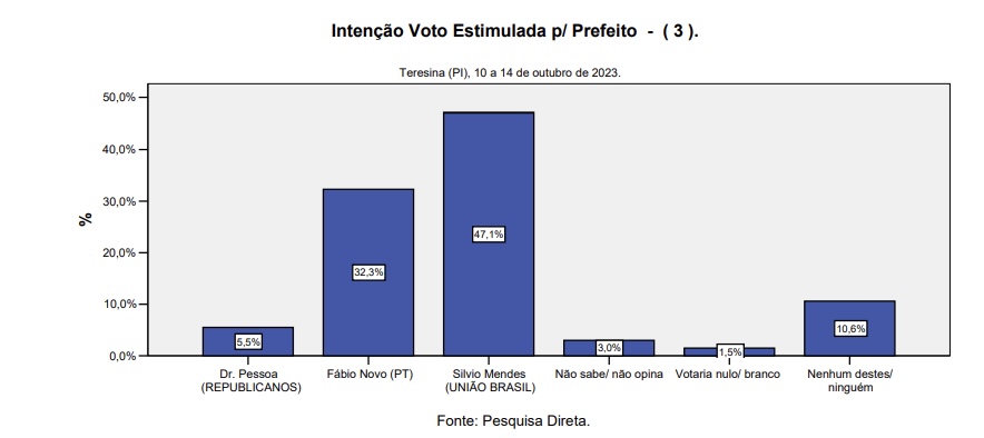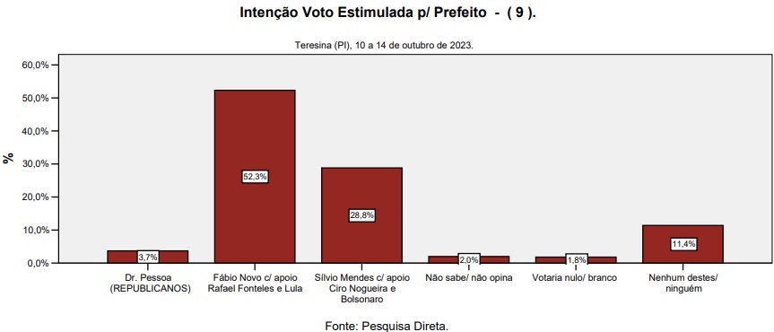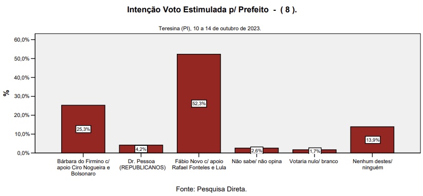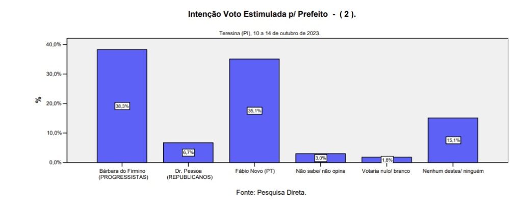 Na pesquisa estimulada, em disputa com a deputada Bárbara do Firmino (Progressistas), o parlamentar petista apresentou um crescimento de cinco pontos percentuais em comparação com pesquisa realizada em julho. Ele passou de 29,90% para 35,10% das intenções de voto, enquanto Bárbara caiu de 42,70% para 38,30%. Dr. Pessoa (Republicanos), atual prefeito de Teresina, passa de 5,70% para 6,70% das intenções de voto, e mais de 15% não votaria em nenhum dos três nomes apresentados.