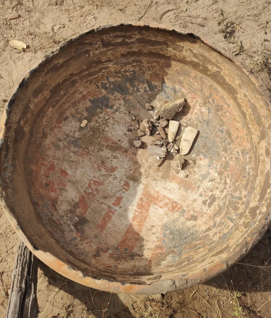 Trata-se de uma gamela de argila com tampa, que guardava ossos e pedaços de ferramentas, como a ponta de um machado. Pelas imagens, é possível perceber que havia uma pintura no interior da peça, feita a base de óxido de ferro.