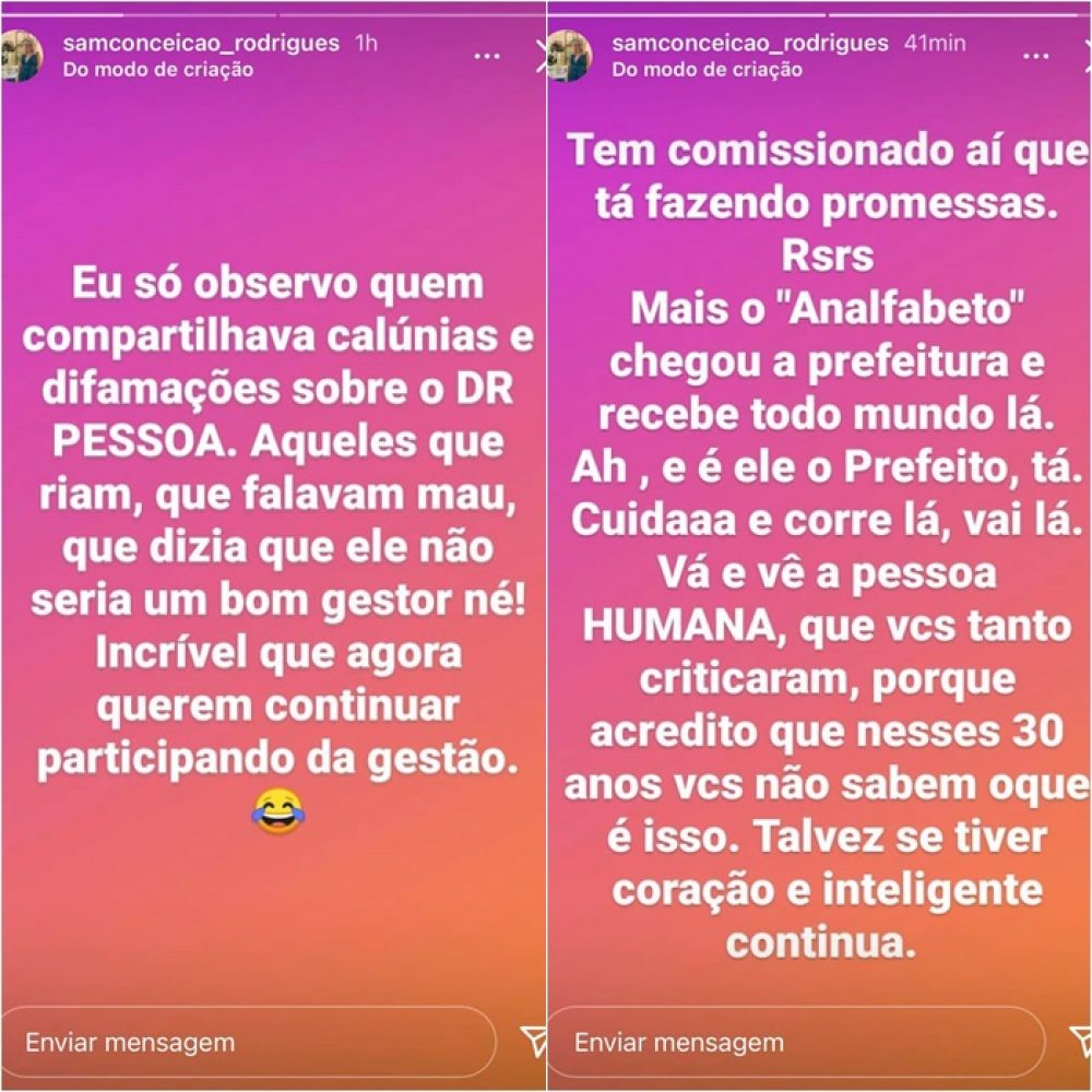 “Eu só observo quem compartilhava calúnias e difamações sobre o DR PESSOA. Aqueles que riam, que falavam mau, que dizia que ele não seria bom gestor né! Incrível que agora querem continuar participando da gestão”, finaliza.