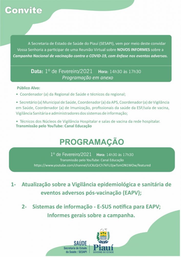 A Secretaria de Estado da Saúde (Sesapi) realiza, nesta segunda-feira (1º), às 14h30, de forma virtual, treinamento sobre os novos informes referente à Campanha Nacional de Vacinação Contra a Covid-19, com ênfase nos eventos adversos, para orientar os municípios como abrirem os protocolos de investigação e realizarem as notificações via sistema.