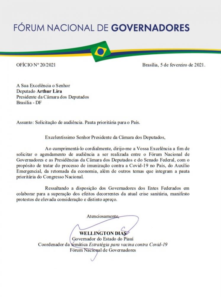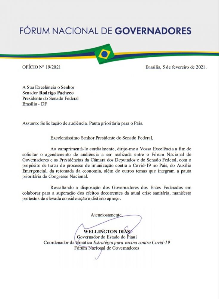 Os governadores do Brasil, por meio do Fórum Nacional dos Governadores encaminharam na sexta- feira (05), ofícios destinados aos novos presidentes do Senado e da Câmara dos Deputados, Rodrigo Pacheco e Arthur Lira , solicitando o agendamento de audiência para tratar do processo de imunização contra a Covid-19, sobre o auxílio Emergencial e da retomada da economia, além de outros temas prioritários.