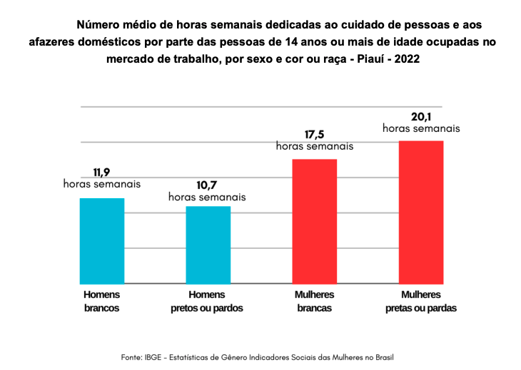 Em uma análise por sexo considerando a mesma cor ou raça, as mulheres pretas ou pardas ocupadas no mercado de trabalho dedicavam 20,1 horas semanais para esses afazeres, enquanto que homens pretos ou pardos dedicavam 10,7 horas, ou seja, 9,4 horas semanais a menos (47%).