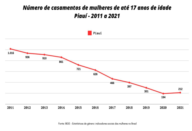 De acordo com as Estatísticas do Registro Civil do ano de 2021, no Piauí foram realizados 212 casamentos com meninas de até 17 anos de idade, o que representava cerca de 2,5% do total de casamentos realizados no estado. Em 2011, foram realizados 1.016 casamentos, o que representava cerca de 7,9% do total de casamentos daquela época; comparando os dois números, em 10 anos ouve uma redução de quase 70% na proporção dos casamentos nessa faixa etária.