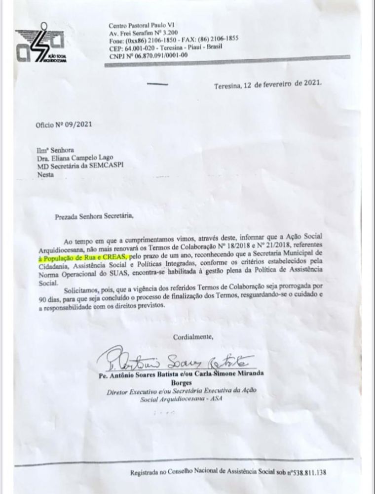 A prefeitura de Teresina foi surpreendida com a decisão unilateral da Ação Social Arquidiocesana (ASA) de não renovar os termos de colaboração que mantinha com o município para atendimento à população de rua e CREAS.