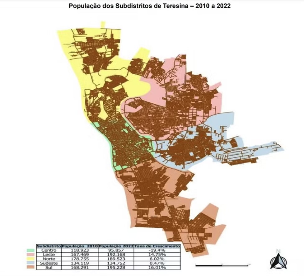 As outras regiões de Teresina apresentaram crescimento da população no período, com destaque para os subdistritos Sul e Leste.