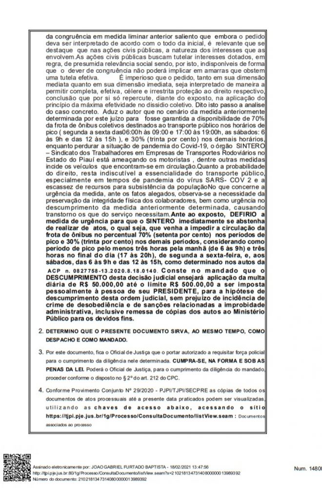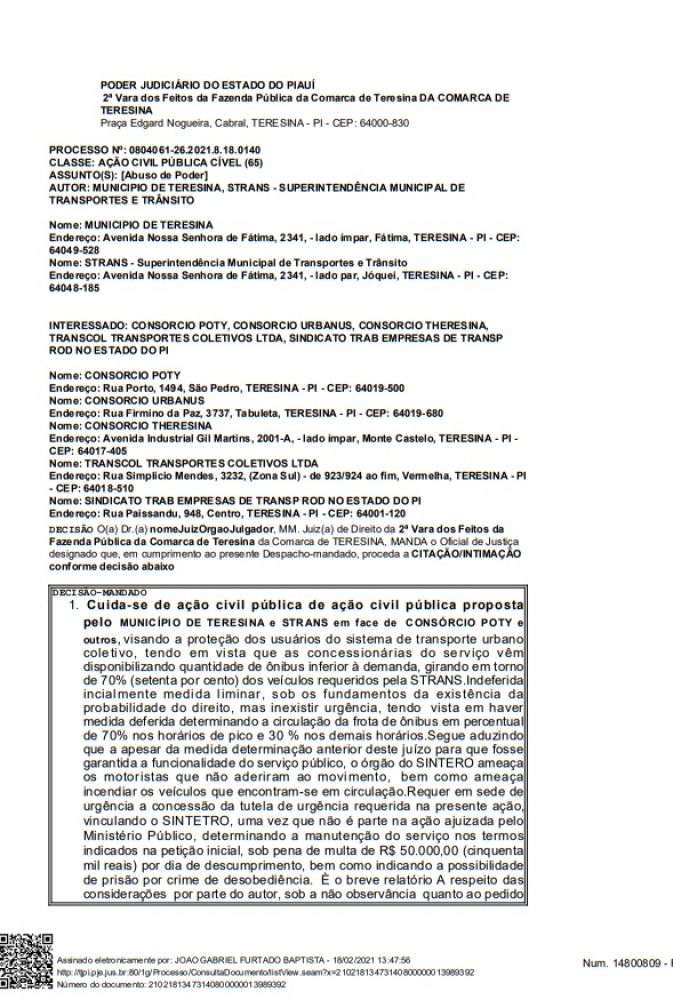 O juiz João Gabriel Furtado Baptista, da 2ª Vara dos Fetios da Fazenda Pública de Teresina, proferiu uma decisão em resposta a Ação Civil Pública proposta pelo município de Teresina, em face das empresas Transcol, Consórcio Urbanus, Consórcio Poty, Consórcio Theresina e o Sindicato dos Trabalhadores das Empresas de Transportes Rodoviários no Estado do Piauí.