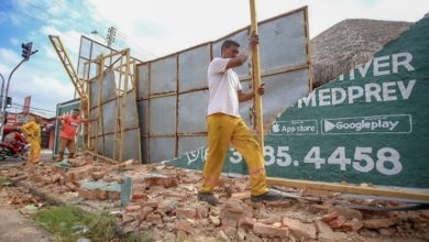 Ventania e forte chuva derrubam placas e muros na zona Norte