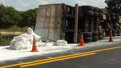 Caminhão carregado de goma tomba e deixa feridos na BR-343