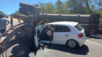 Uma carreta carregada de milho tombou e atingiu um veículo de passeio, modelo Gol, na manhã deste domingo (14), na…