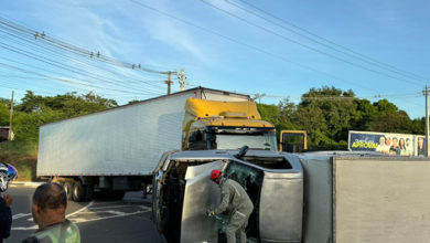 Um caminhão tombou após a colisão com uma carreta na rotatória de acesso ao açude Caldeirão na BR 343, na…
