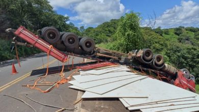 Carreta capota e fica pendurada em ribanceira na cidade de Picos