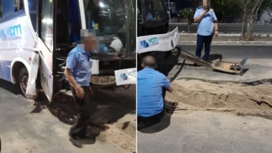 Idosa cai de cadeira após ônibus ficar preso em buraco na Capital